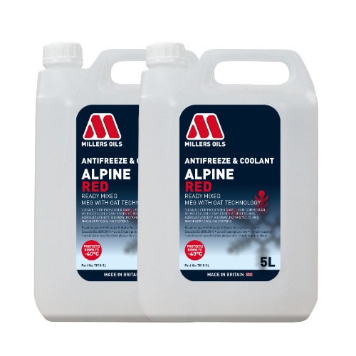 A red Monoethylene Glycol (MEG) with Organic Acid Technology (OAT) antifreeze and coolant premixed with water at 50:50 ratio that will provide freeze protection down to -40 °C. Alpine Red Ready Mixed exceeds most of the European and International quality standards. Suitable for use in petrol and diesel engines (including Hybrids), and will provide all year round protection. This product does not contain nitrates, amines, phosphates, borates, silicates and other mineral additives (NAP free).